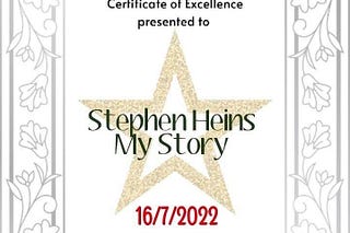 Stephen Heins “Certificate of Excellence Presented for My Story”