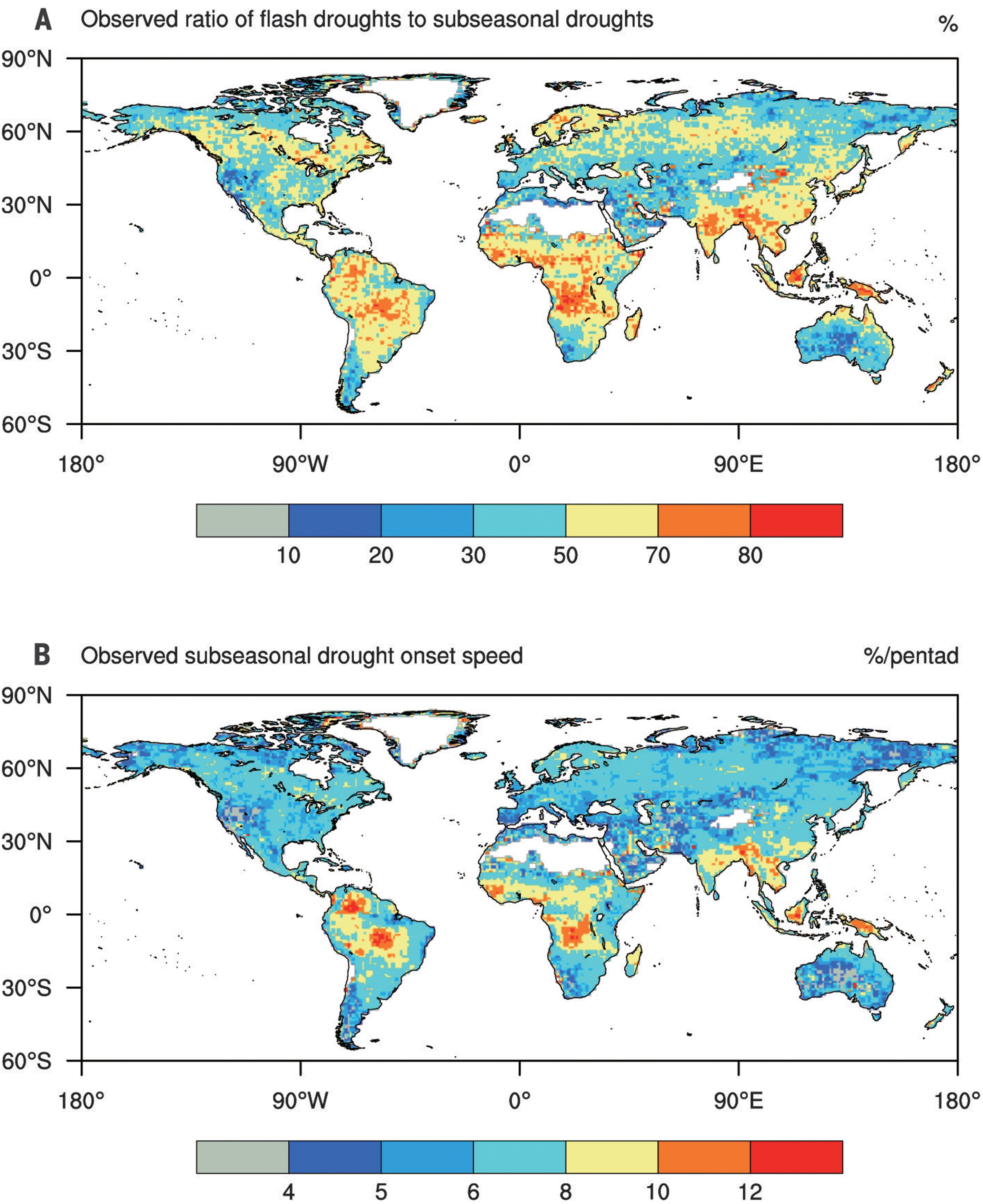 On the basis of estimates of soil moisture from three global reanalyses from 1951 to 2014, subseasonal drought events are identified as pentad-mean soil moisture declines from above the 40th percentile to below the 20th percentile and then increase to above the 20th percentile again [supplementary materials (SM), materials and methods]. The minimum duration for subseasonal droughts is 20 days to exclude dry spells that are too short to cause substantial impacts. We then divided the subseasonal droughts into flash and slow droughts depending on the rate of the reduction in soil moisture (21) during the onset stage (fig. S1). We used the ratio of flash drought events to the total number of subseasonal drought events, and the subseasonal drought onset speed (SM, materials and methods), to quantify the transition to flash droughts by determining whether there are significant trends in these two indices. Flash droughts tend to occur more often than slow droughts over humid regions with lower aridity (Fig. 1A and fig. S2), where flash-drought frequency is two to three times greater than other regions (fig. S3A). By contrast, slow drought occurrence has smaller spatial variability (fig. S3B). Flash droughts usually last for 30 to 45 days, whereas slow droughts usually last for 40 to 60 days (fig. S4). The uncertainty across the three reanalyses is low over most humid and semihumid regions but high over arid regions (fig. S5).