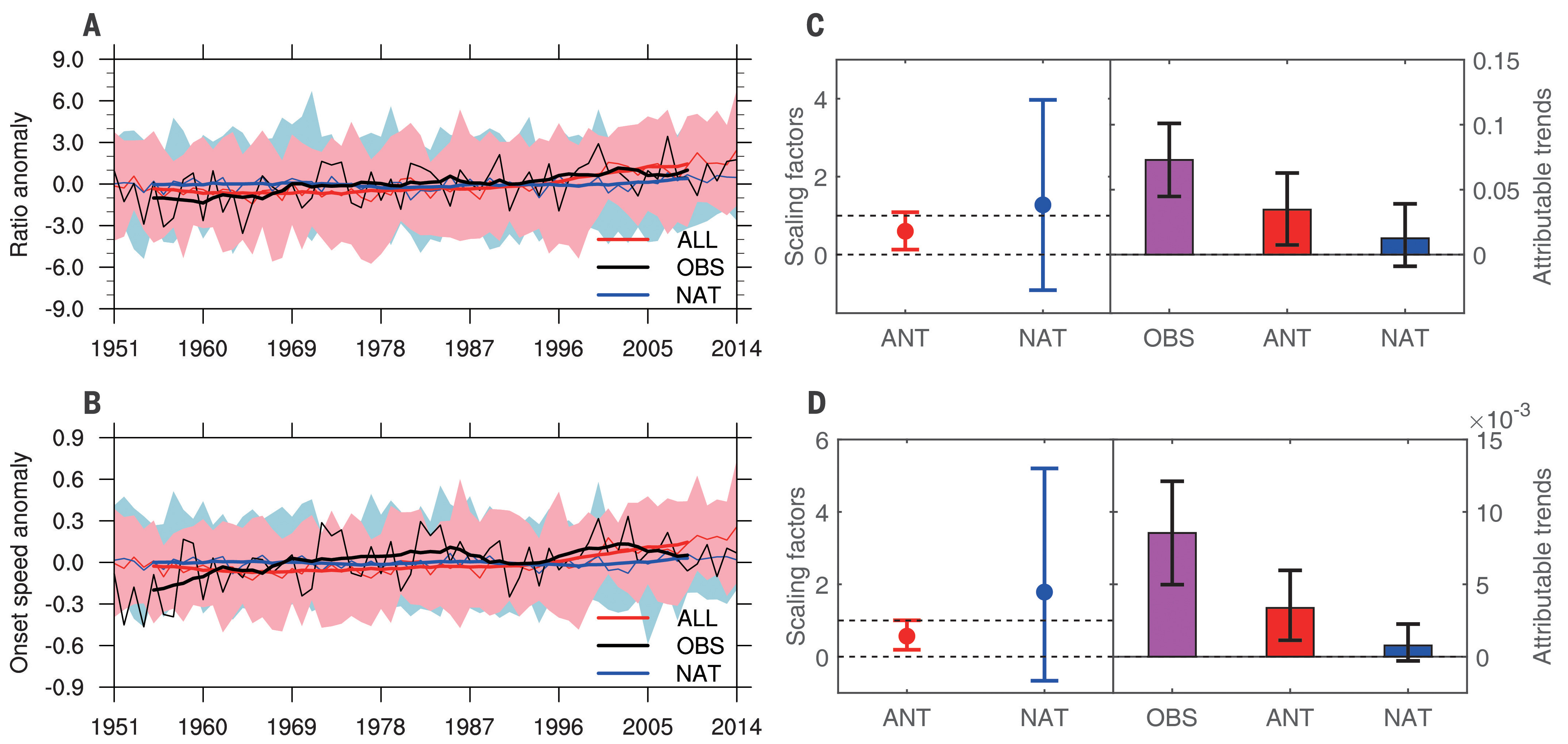 The upward global trends are well captured by the state-of-the-art CMIP6/ALL multi-model ensemble simulations (P < 0.1) (Fig. 2, A and B), in which both the anthropogenic climate forcings (anthropogenic emission of, for example, greenhouse gases and aerosols) and natural climate forcings (solar and volcanic activities) are considered. The CMIP6/ALL ensemble simulations also roughly capture the spatial patterns of long-term climatology of flash drought ratio and subseasonal drought onset speed (fig. S8). However, the global trends are not captured by the CMIP6/NAT ensemble simulations that only consider natural climate forcings (Fig. 2, A and B). The best estimates of scaling factors (SM, materials and methods) show that only the ANT (ALL-NAT; anthropogenic forcings) signal is detectable, with contributions of 48% (10 to 86%) and 39% (13 to 70%) to the increases in flash drought ratio and subseasonal drought onset speed, respectively (Fig. 2, C and D). With CMIP5 models included, the detection and attribution results remain similar (fig. S9). We therefore conclude that the global transition to more frequent flash droughts during the past 64 years is influenced by anthropogenic climate change.