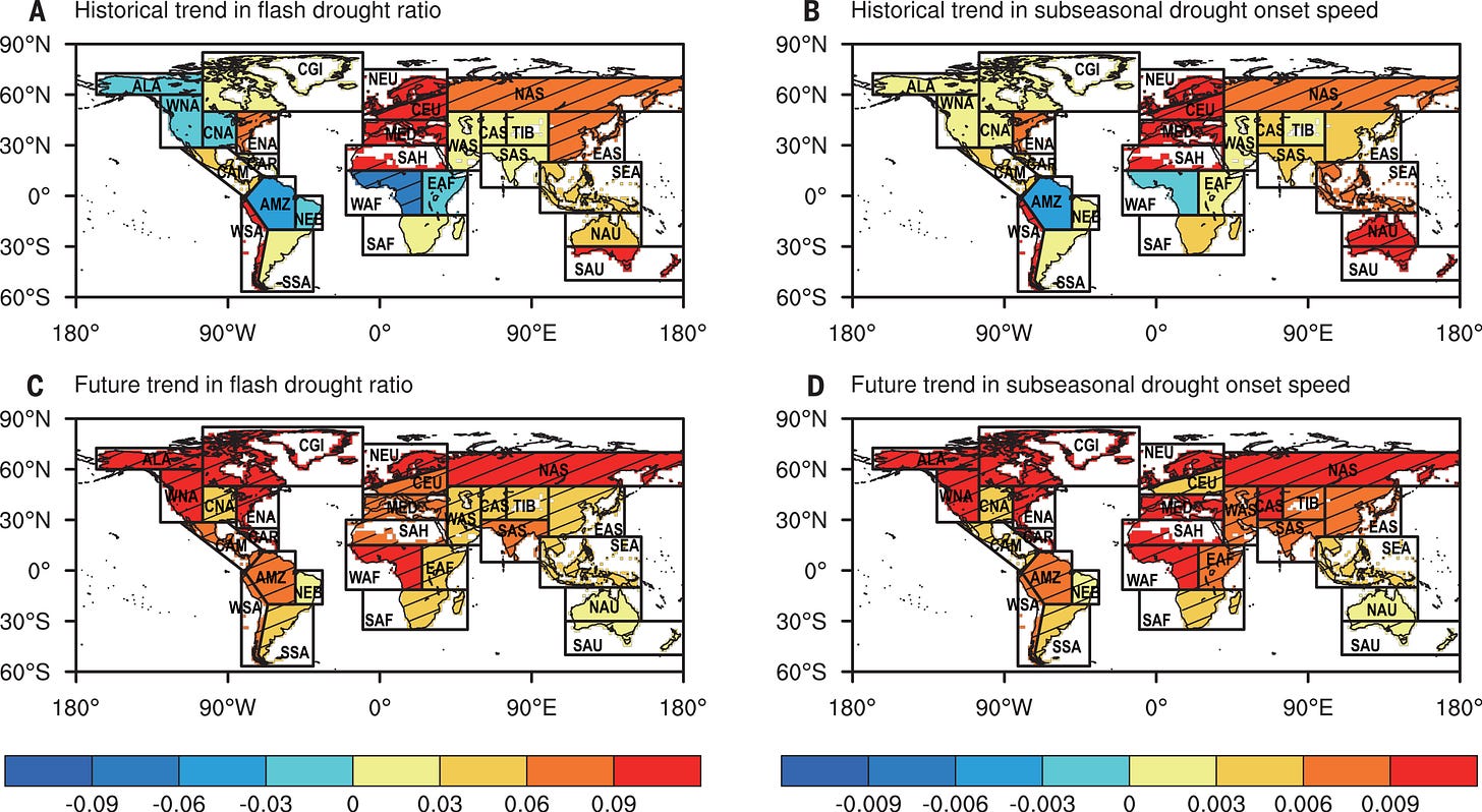 A significant global transition to flash droughts is driven by regional increases in flash drought ratio over 74% of the IPCC SREX regions, notably for the significant increases (P < 0.1) over East and North Asia, Europe, Sahara, and the west coast of South America (Fig. 3A). Moreover, the onset speed of subseasonal droughts has increased over most regions, with significant increases (P < 0.1) over North Asia, Australia, Europe, Sahara, and the west coast of South America (Fig. 3B). These regions’ significant increases in flash drought ratio and subseasonal drought onset speed (Fig. 3, A and B) are largely because of the increases in the frequency and onset speed of flash droughts (fig. S12). The regions with increasing onset speed but decreasing flash drought ratio suggest that the transition from slow to flash droughts might not be stable (Fig. 3, A and B). For example, East Africa, Northeast Brazil, and western North America show a historical decline in the flash drought ratio (Fig. 3A), but the frequency increases for both flash and slow droughts (fig. S12, A and C). These regions may eventually switch to a more stable transition once the onset speed increases to a certain level in the future. There are also regions with decreased frequency for both flash and slow droughts (such as eastern North America, southern South America, North Australia, and Southeast Asia), but the drought onset speed has increased (fig. S12). Almost all regions—except the Amazon and West Africa—show increasing trends in flash drought ratio and/or subseasonal drought onset speed (Fig. 3, A and B). For the Amazon, there is no evidence of a transition to flash droughts because drought onset speed decreases and flash-drought frequency decreases, whereas slow-drought frequency increases (fig. S12). For West Africa, both flash and slow droughts increase, whereas flash droughts occur faster and slow droughts occur slower, which suggests a more extreme drought condition even without an obvious transition signal (fig. S12). The results are similar for those with different drought thresholds (figs. S13 to S15).