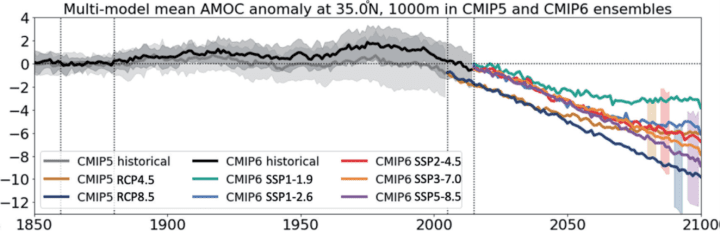Figur 3. AMOC-flow anomalies according to IPCC model simulations. The thick grey and black lines are the history as simulated by the two latest model generations. The colored lines are forecasts from the models according to selected emissions scenarios. Flows are in Sverdrups (Sv, million cubic meters per second). Source: AR6 WG1 fig. 9.10, which is taken from [3]