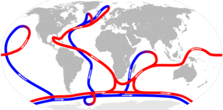 The heat transport is a balance of the northward flux of the warm Gulf Stream, Ekman pumping, and southward fluxes of cooler thermocline, and cold North Atlantic deep water. The circulation is completed after a very long time as the deep waters rise to the surface again in the Southern Ocean. The turnover period of AMOC is many hundreds of years.