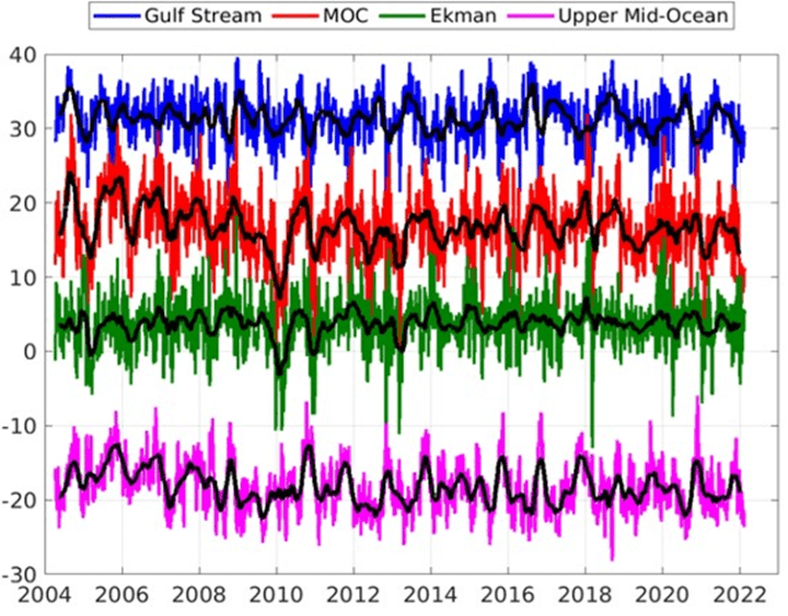 Figur 4. Readings of the AMOC flows in Sverdrups (Sv). (A)MOC is the red curve with a flow of 16.8 ±4.6Sv. It comprises the Gulf stream (green, 31.3 ±3.1 Sv), the Ekman transport (black, 3.7 ±3.5 Sv), and the cold, deep southbound flow (lila, -18.2 ±3.4 Sv). The latest data are up until March 2022. Source: RAPID.