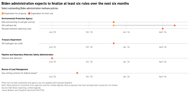 Also, the Bureau of Land Management is working on a rule to curb gas leakage from production on federal lands; the move would replace an Obama-era standard that was scrapped by the Trump administration. The BLM rule was projected to be final in September but has yet to enter White House review.