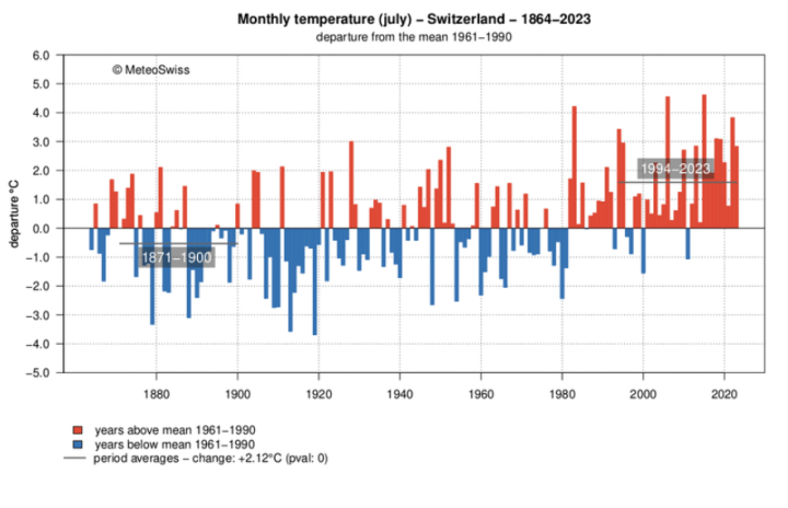 Amazingly, the article claims that the Swiss temperatures in July have warmed by 35F since the 1800s, with July 2023 temperatures being 60F. I repeat 35F increase (or about 19C), which means the mean temperature in July would have been 25F…..well below freezing in July.