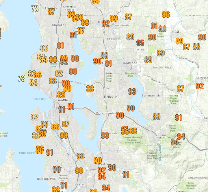 Totally different than the Seattle Times map. Temperatures ranged from the 70s near the water to mid to upper 80s away from the water. No huge heating over Lake Washington. The warmest temperatures are in more rural areas (mid-90s). Downtown Seattle is NOT a huge hot spot as pushed by the Seattle Times. Their map is simply wrong. Urbanization is not making some Seattle locations 12F warmer than rural areas.