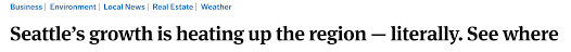 The figure below was found in the Seattle Times story, and was based on a report from climate advocacy group, Climate Central. The “angle” of the story is how the growth of the city and loss of trees are greatly warming the environment.