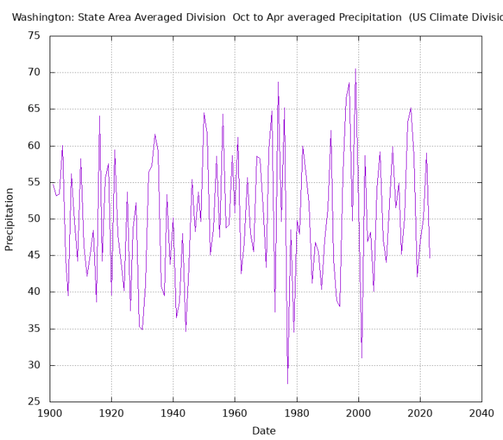 Want proof? Here are the NOAA precipitation totals over Washington since 1900. Lots of ups and downs (weather variability) but little long-term trend. Yes, this year is on the low side, but not a record-breaking low.