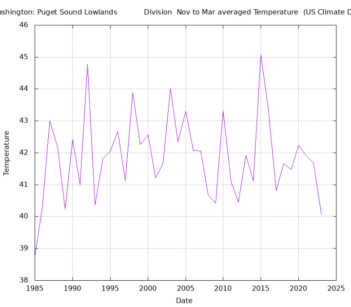 So have winter temperatures in our region warmed substantially over the past? Below are the temperatures over the Puget Sound lowlands over the past 40 years, when global warming has been most noticeable (see below).
