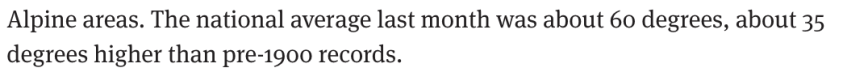 This is nuts. But don’t believe me. Here are the official statistics from the Swiss government. A 2.12 C increase. That is about 3.8F. NOT 35F.