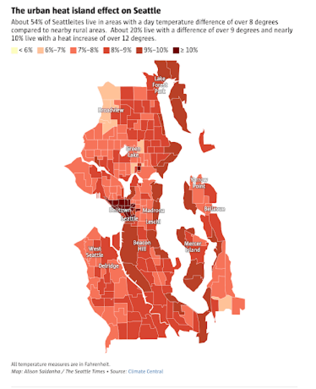 Saturday’s front-page story describes how because of urbanization “more than half of Seattle’s population resides in areas where daytime temperatures are over 8 degrees hotter than they would be naturally” and nearly 10% are in parts of the city recording an increase of over 12 degrees.”