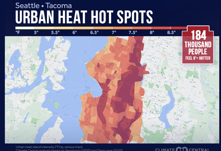 Seattle’s heat island is greatly mitigated by the presence of Puget Sound, the Strait, and the Pacific Ocean. There is a reason that Seattle’s summer temperatures are far milder than Portland’s.