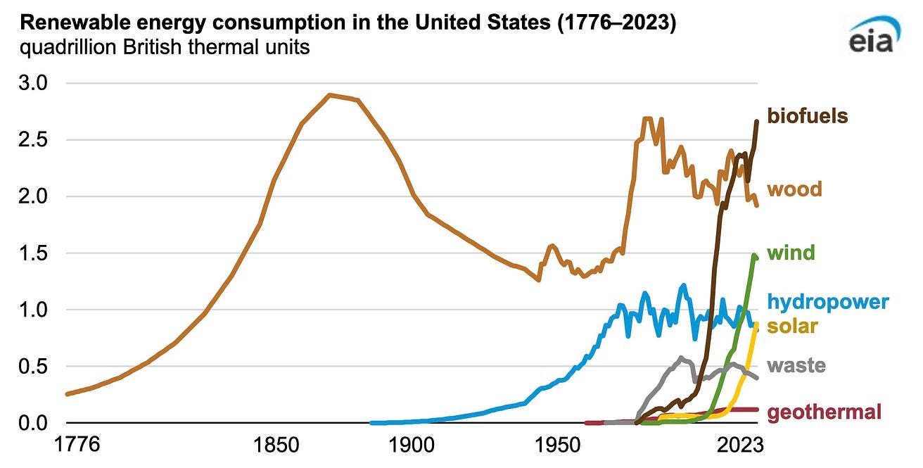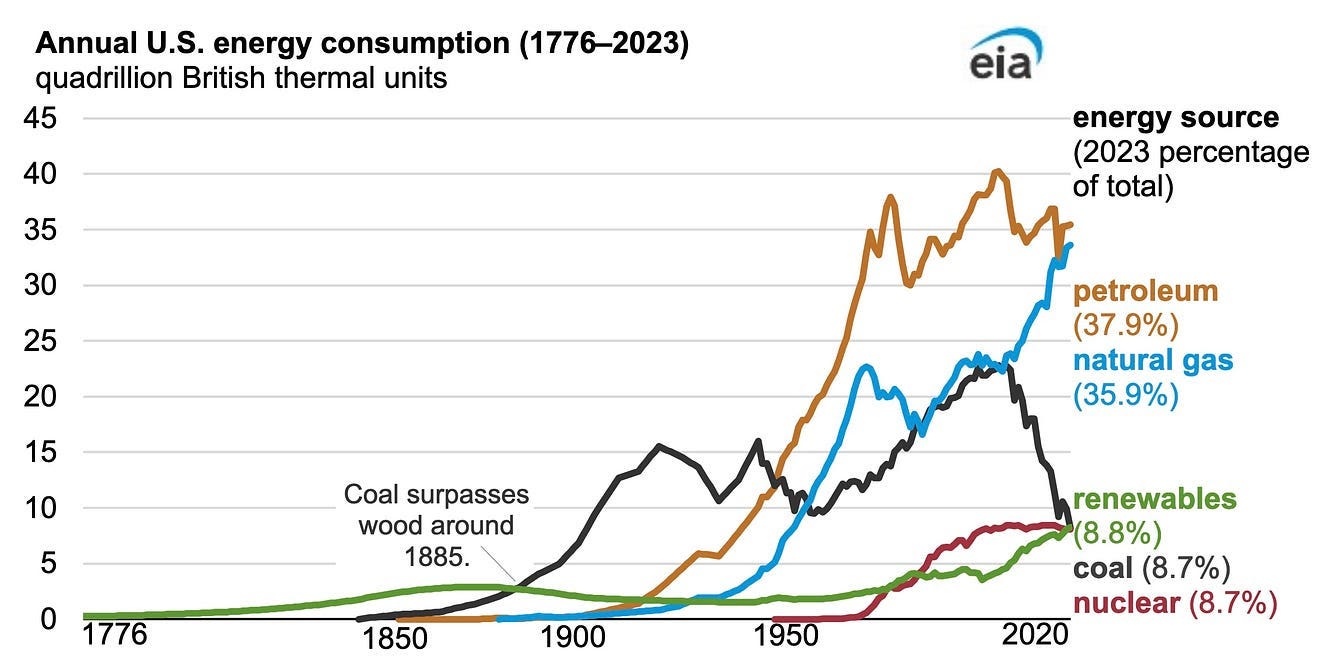 One’s first reaction is to imagine green energy is coming on strong, as it now exceeds coal ad nuclear energy.contributions. But, look more closely. Renewables still only represented 8.8% of the total or 8.245 quadrillion Btus, in 2023, according to this table from the EIA that is the apparent source of the data.
