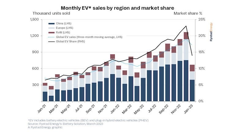 ThEV salesEV sales collapse as subsidies and tax credits come to an abrupt halt collapse as subsidies and tax credits come to an abrupt halte global electric vehicle (EV) market is reeling from one of the most dramatic collapses in monthly sales to date, with Rystad Energy research showing that only 672,000 units were sold in January, almost half of December 2022 sales and a mere 3% year-on-year increase over January 2022. The EV market share among all passenger car sales also tumbled to 14% in January, well down on the 23% seen in December.