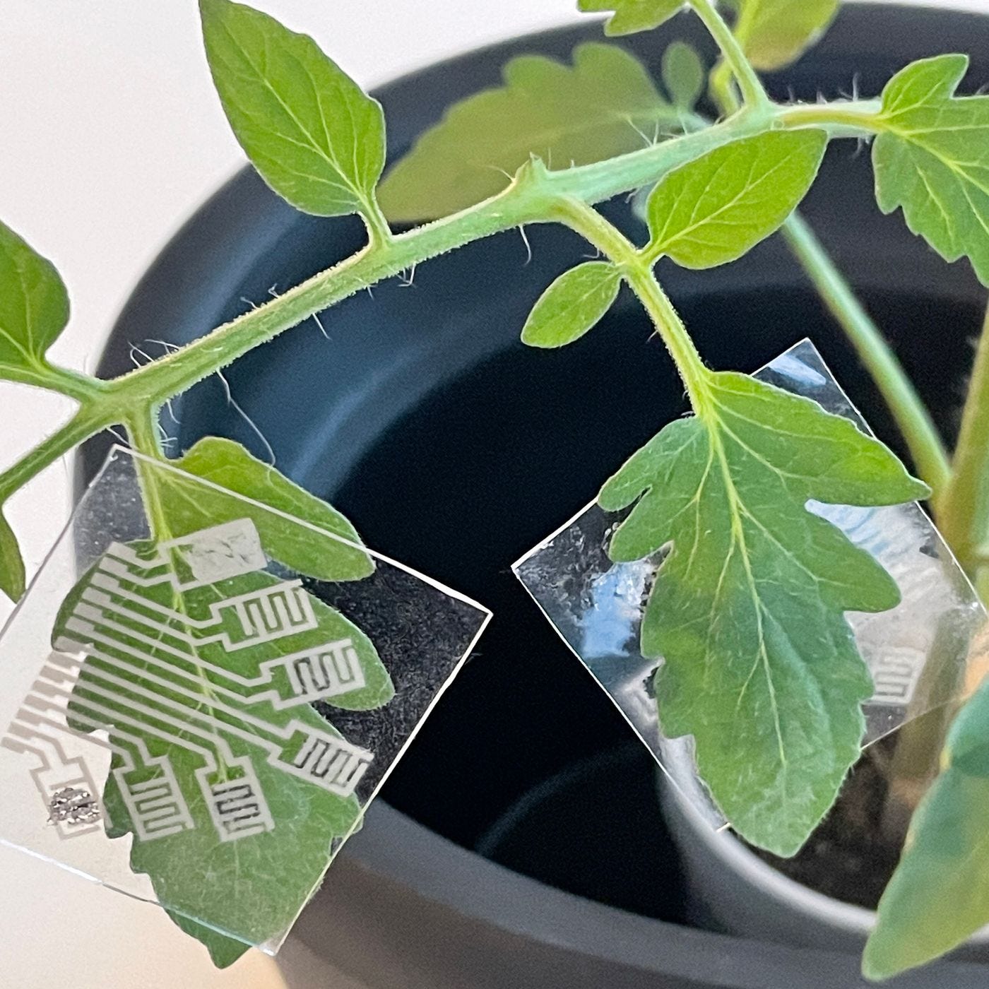 Zhu is part of a team that built and demonstrated sensors that can gather information such as hydration and temperature in plants and their immediate environment, as well as chemical hormones released by the plant in response to infection or environmental stress. Made of silver, gold, and carbon nanomaterials embedded in a flexible polymer, the sensors were able to detect infection in tomato plants within four days, the team reported in a study published in the journal Science Advances in April.