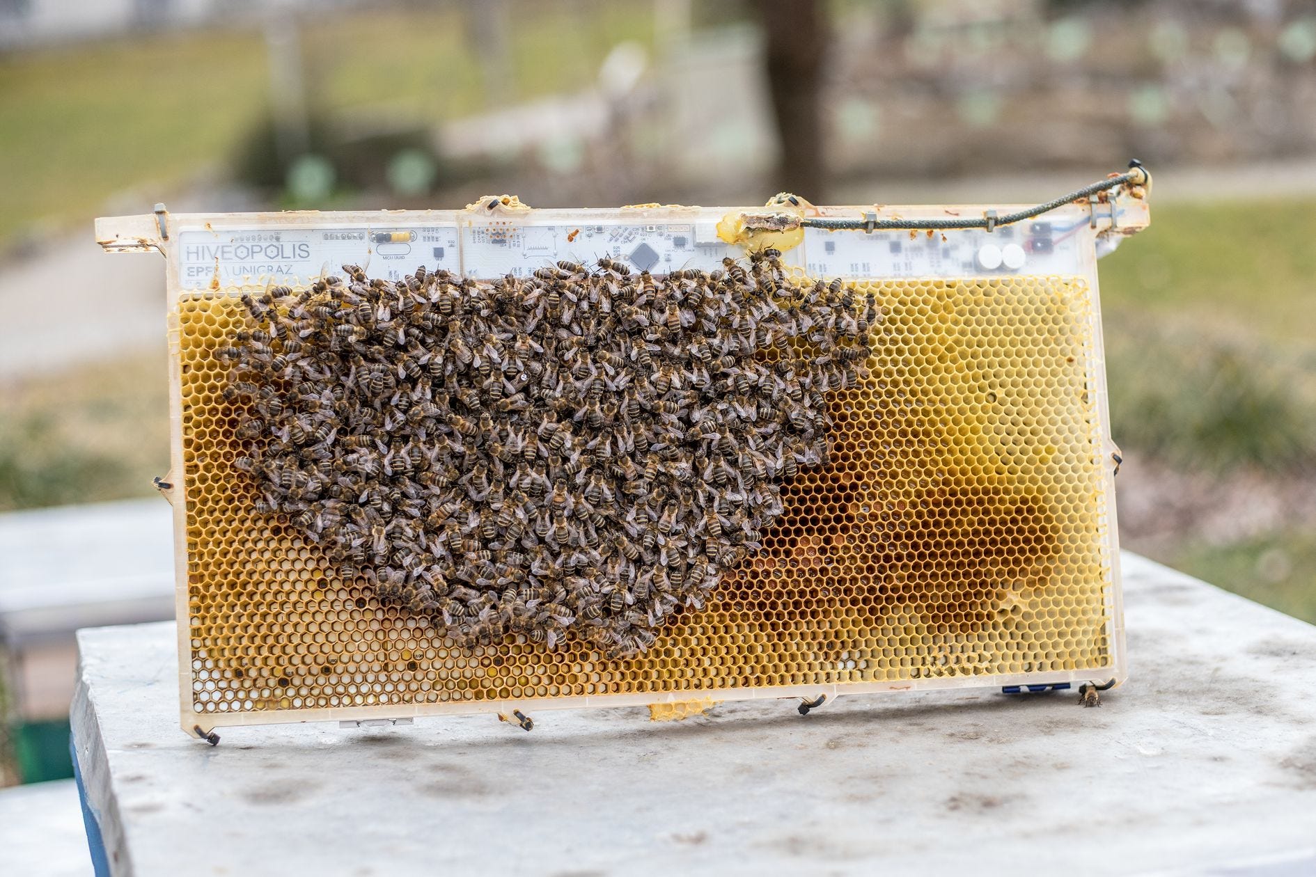 The team has built a device that monitors bee colony temperatures during the winter within wooden boxed hives used in agriculture. Thermal sensors and heating elements are built into a beehive frame, and covered in a wooden layer with a hexagonal pattern coated in melted beeswax to encourage bees to build on it.