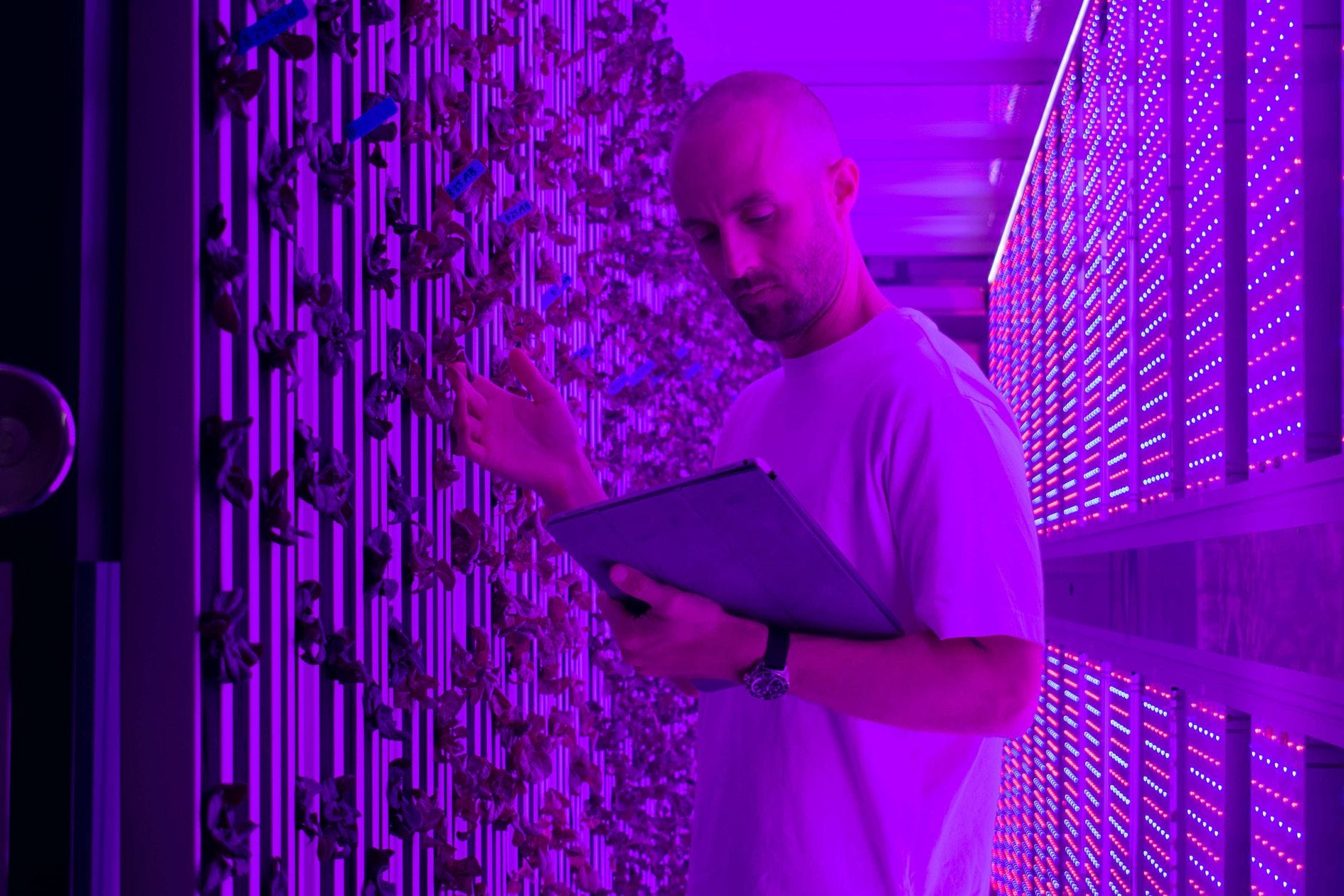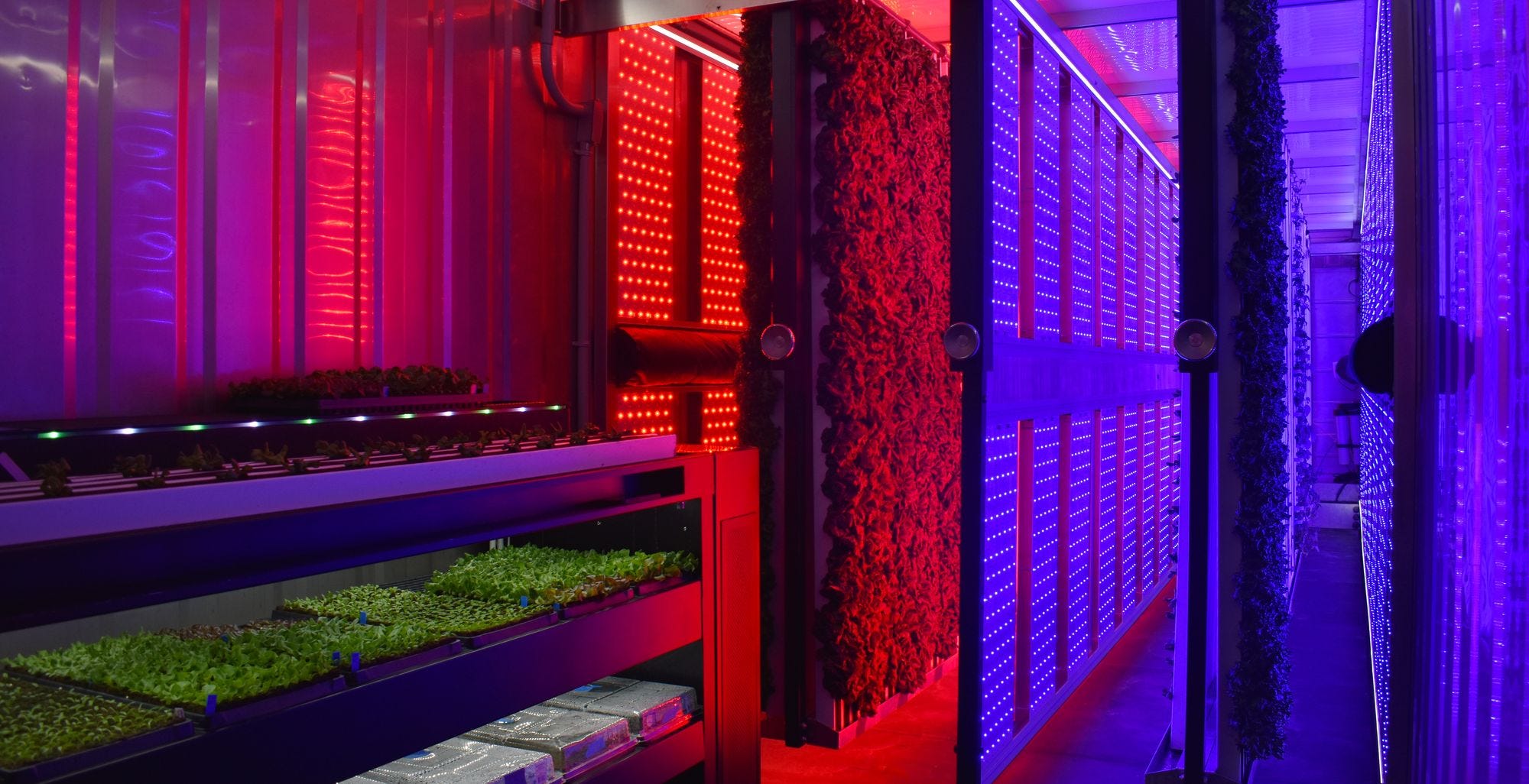 Plants growing in Freight Farms shipping containers are lighted with LEDs. FREIGHT FARMS