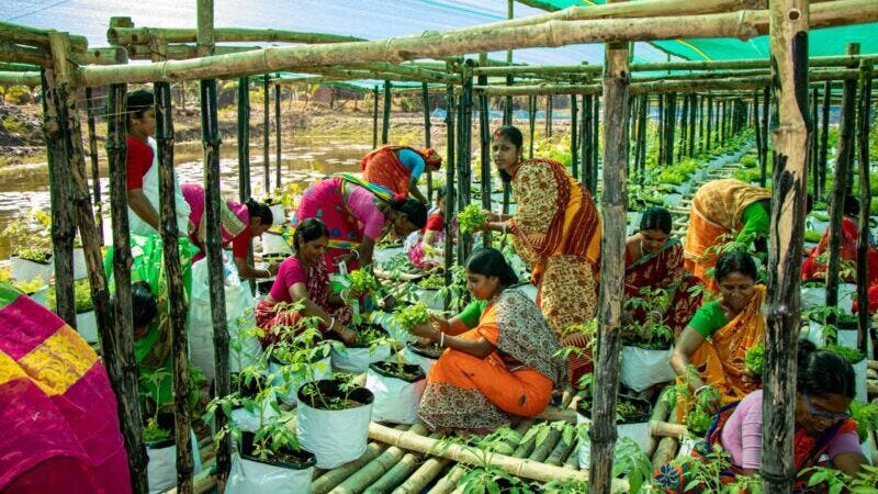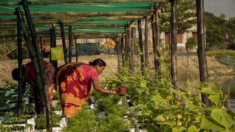 Women beneficiaries of Self-Help Group (SHG) nurturing the summer crops in a float-farm in Amtoli village in the Sundarbans region of southern India and parts of Bangladesh (Photo: South Asian Forum for Environment)