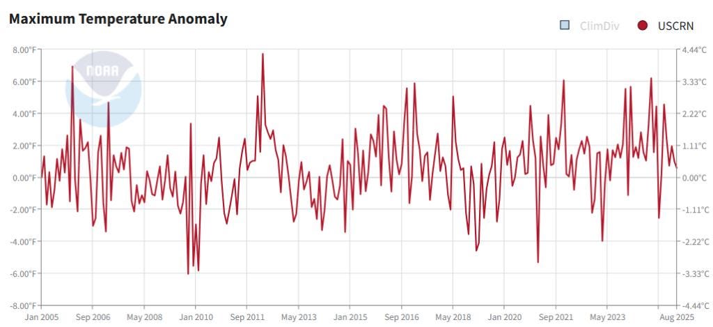 More recently, the U.S. Climate Reference Network (USCRN)—a pristine system of modern sensors launched in 2005 to avoid problems like urban heat contamination—shows no sustained increase in high-temperature extremes since its inception, seen in Figure 2 below: