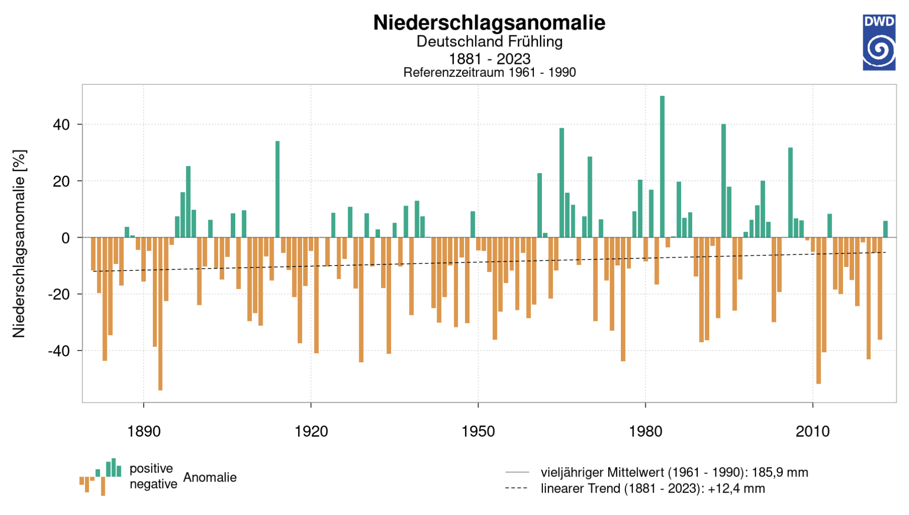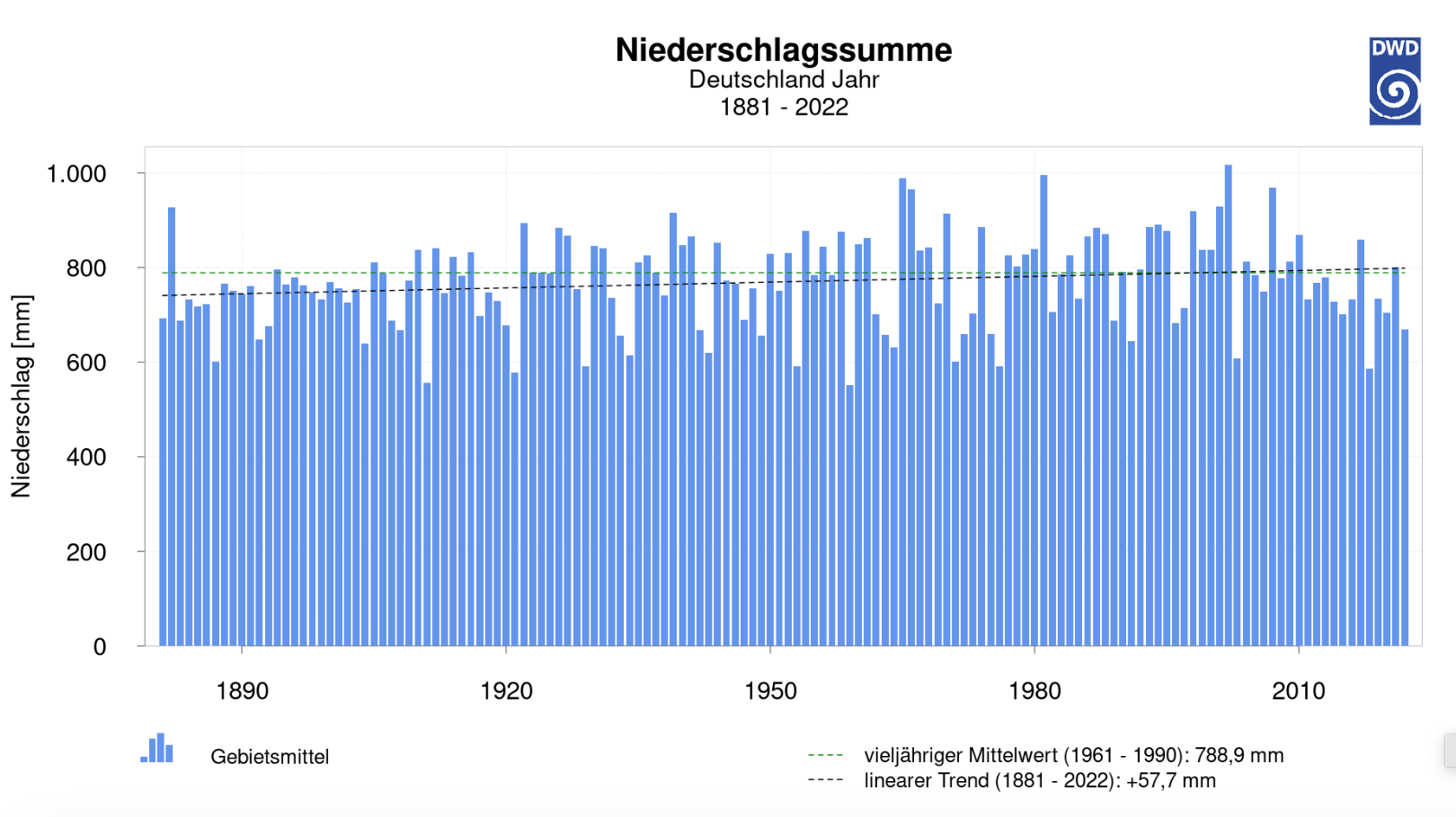 The extremely inconvenient rain continued through August, and slowly these paint-by-numbers articles after the manner of “X bad thing, Y bad thing, Z bad thing – why these bad things are bad” began, well, to dry up. What was worse, obnoxious internet people began to ask whether we were really in any kind of drought at all. They noted that the statistics compiled by the German Weather Service showed nothing but an increase in annual precipitation since the start of record-keeping in 1881: