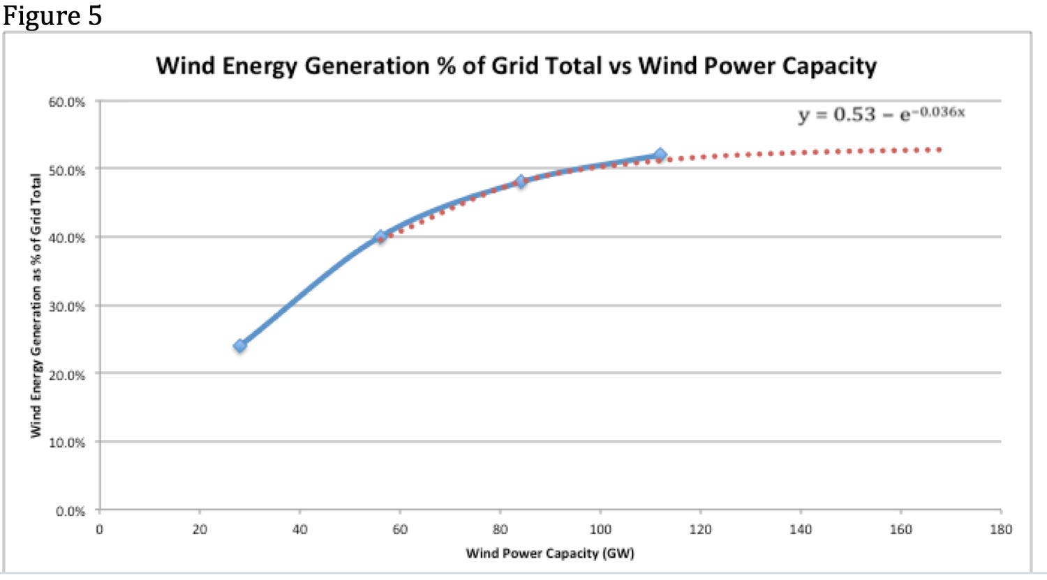 The percent of generation from wind approaches a limit asymptotically. The particular limit (53% of total annual electricity generation in this graph) is driven by assumptions in the spreadsheet. The most important ones here are that the generation from the “other” sources does not change from 2022 actual figures, and that the generation from natural gas will not go below 1.373 GW (which was the lowest natural gas output at any data point in 2022). However, if those assumptions are eliminated, and wind is commissioned to replace everything to the extent it is capable of doing so, it is apparent that the percentage of electricity generated from wind will still experience rapidly slowing increases as more wind capacity is added, and will approach a limit asymptotically. This means that each incremental addition of wind generation capacity produces electricity that is more and more costly, with the costs accelerating rapidly after the tripling of existing capacity.