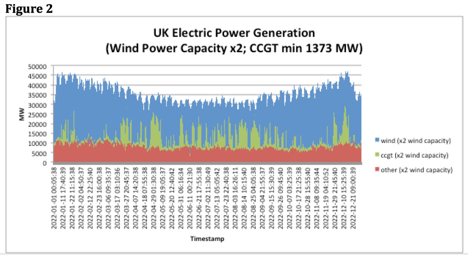 I start by doubling the value of wind power generation at each observation point in the 2022 GridWatch dataset. It results in total wind generation of 123,311 GWH per year. Conversely, I reduced gas turbine power generation at each interval by the amount required to keep the new sum of wind and gas turbine power generation equal to the original sum. However, at intervals where a doubling of wind power exceeds the original sum, wind power should be limited to the value of the original sum. In addition, gas turbine power generation must not fall below 1,373 MW. I impose this constraint because it is the minimum level of gas turbine generation observed over every period in 2022. Both these constraints result in a curtailment of wind energy generation of 18,505 GWH, or 15% of the total wind energy generated, and useful wind energy generation of 104,805 GWH, or 40% of the total energy provided to the grid.