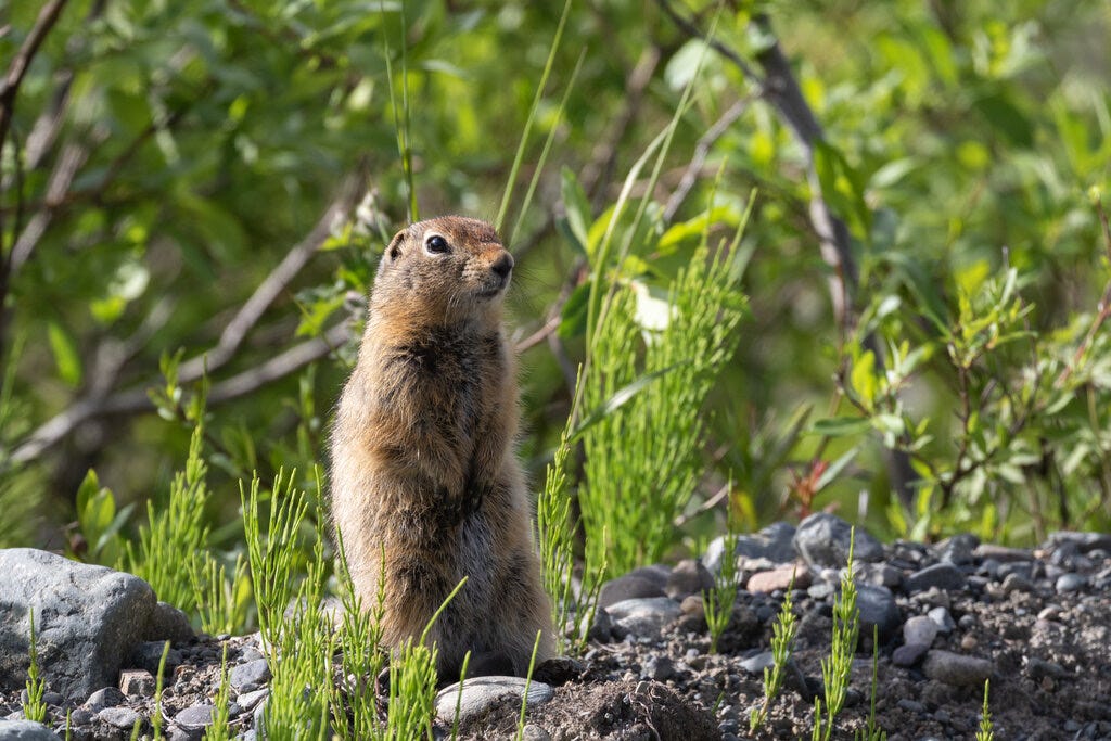 Arctic ground squirrels might look cute, but males can be very territorial. They get into a lot of fights during mating season, some deadly. They have tails, but not long, bushy ones like squirrels found farther south. And they make distinctive whistling noises that could easily be mistaken for the chirp of a small bird. Some Alaska Natives call them parka squirrels because their fur makes a nice, warm fringe for the hood of a coat.