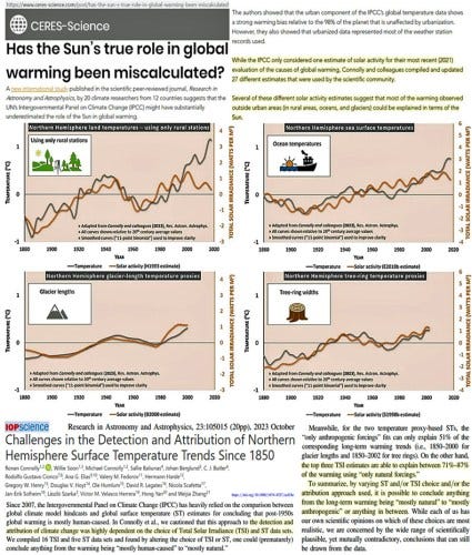 A new study (Connolly et al., 2023 with press release) identifies 27 other TSI estimates (purposely) ignored by the IPCC, several of which suggest modern warming may be up to 71-87% natural – especially if the temperature stations that do not show a strong artificial urban warming bias are used.