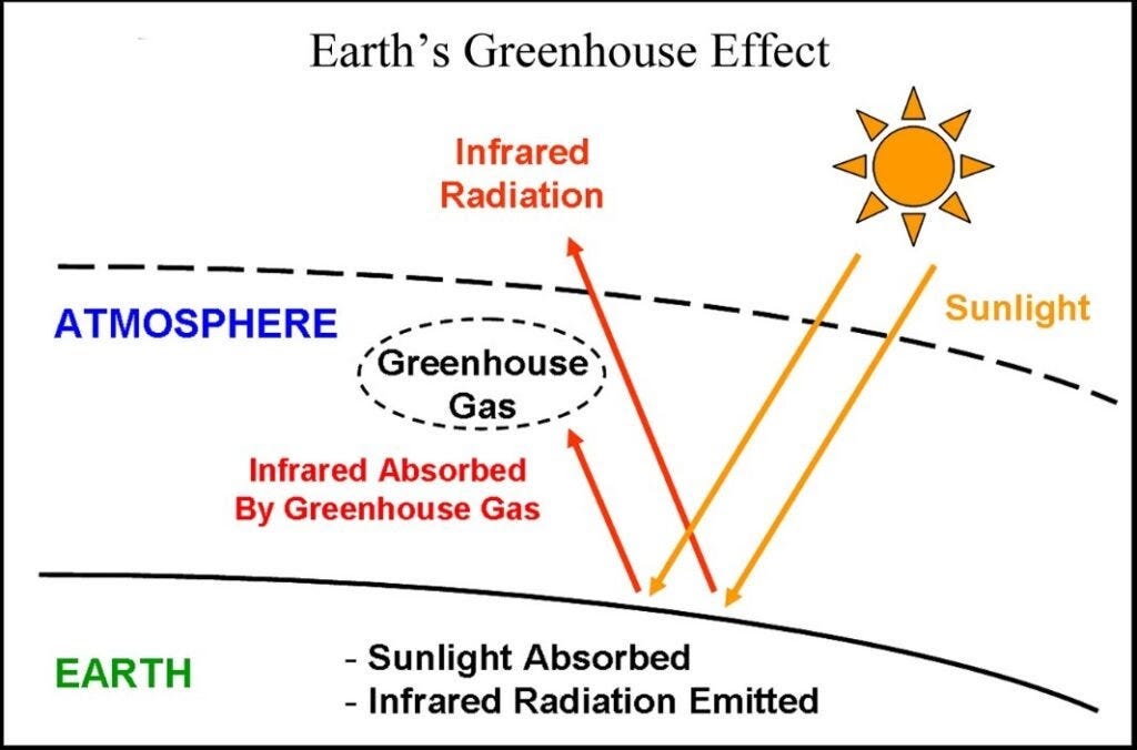 This longwave radiation seeks to leave Earth’s atmosphere, but almost all of it is absorbed by greenhouse gases in the atmosphere. These gases then re-radiate the absorbed energy, which acts to warm Earth’s surface. The warming caused by the absorption of infrared radiation is called the greenhouse effect. Emissions from human industrial processes add to the effect and increase global temperatures.