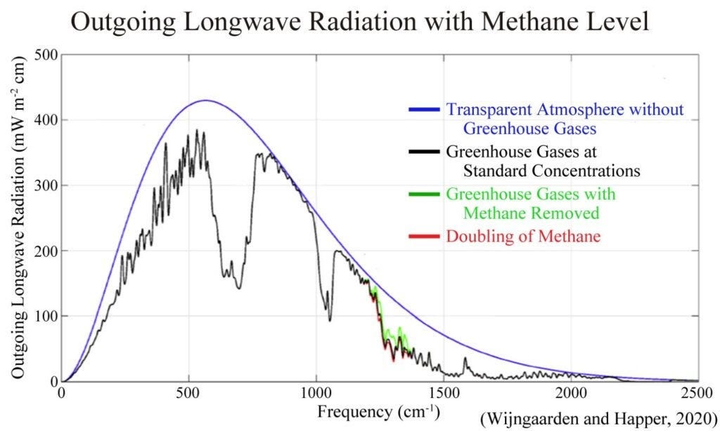A 2020 analysis by Wijngaarden and Happer looked at the absorption of outgoing longwave radiation by methane and other greenhouse gases across the radiation spectrum. The researchers found that doubling atmospheric methane, from either natural or human causes, would increase greenhouse gas absorption by only about 0.3 percent, a negligible amount.