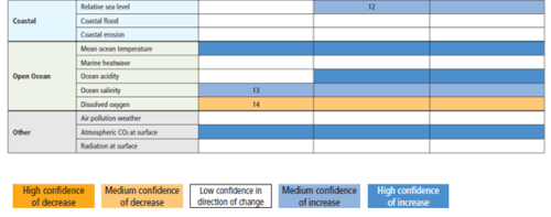 Table 1: Screen capture, Table 12.12, from Page 90 – Chapter 12 of the UN IPCC Sixth Assessment Report. Emergence of Climate Impact Drivers. Note the coastal section is colored white, indicating “Low confidence in the direction of change.”