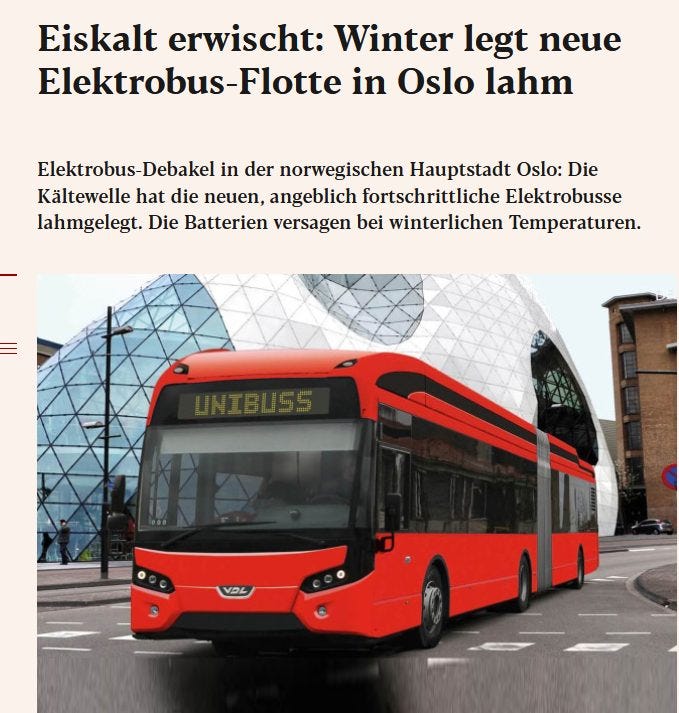 “Oslo’s brand new fleet of electric buses is not designed for these temperatures – their batteries are failing miserably in the icy cold,” reports aussiedlerbote.de/.