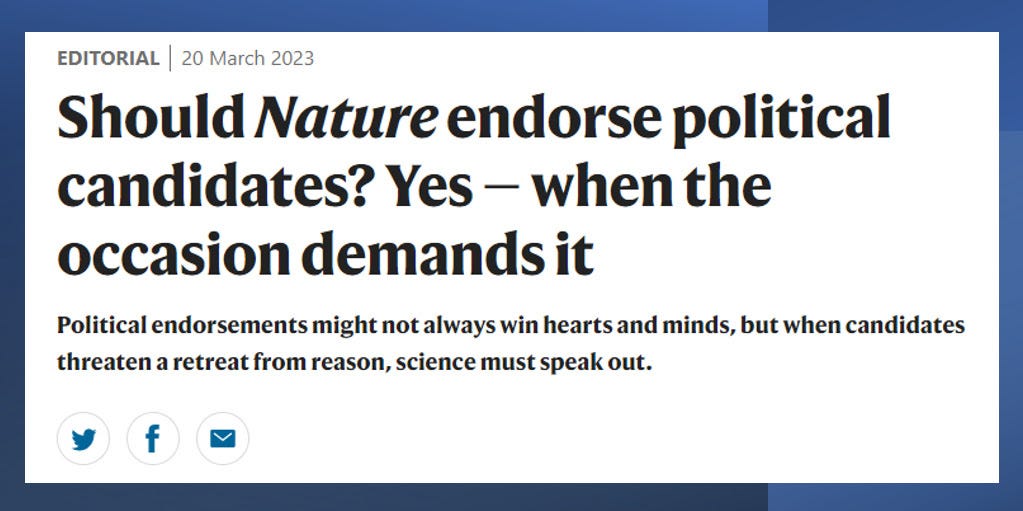 An interesting paper just published looked at the effects among members of the general public of Nature’s 2020 endorsement of Joe Biden for president. The study found that not only did the endorsement fail to lead to greater support for Biden, but it resulted in a loss of trust in Nature and contributed to an increase in political polarization — the opposite effects to thaose intended by Nature with its endorsement.