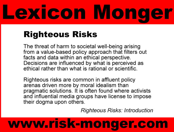 In the introduction to this series, righteous risks were defined as the threat to societal well-being when value-based motives influence decision-making more than facts and evidence. Policies should be determined according to the best pragmatic solutions to complex problems with conflicting interests being addressed through a consensus approach. More and more though, regulators are being led by moral dogma and ethical exclusion techniques dictated by influential stakeholders.
