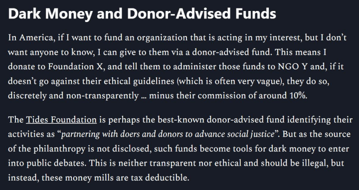 The dark money, non-transparent, donor-advised funds should be made illegal (or at least not tax deductible).