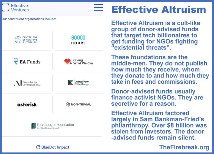The FTX-Sam Bankman-Fried and Sam Altman episodes of the past year reflect another type of righteous risk to be considered, when foundations start to interfere with capitalism and democracy for all the wrong reasons. The “foundation consortium”, Effective Ventures, ties together a series of donor-advised funds targeting high-income individuals (particularly in the tech and crypto sector).
