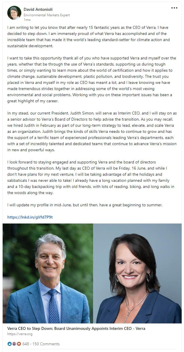 Verra’s CEO David Antonioli decided to walk away from his job following a string of bad press covering Verra’s poor environmental standards:
