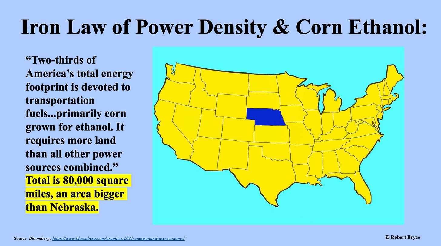 Let’s start by looking at corn ethanol and other biofuels, which have a power density of about 0.1 watt per square meter. Counteracting that paltry power density requires lots of other resources, including fertilizer, diesel fuel, water, and staggering amounts of land. In 2021, Dave Merrill, a reporter and data analyst at Bloomberg, reported that “Two-thirds of America’s total energy footprint is devoted to transportation fuels produced from agricultural crops, primarily corn grown for ethanol. It requires more land than all other power sources combined.” Merrill determined that biofuels require the cultivation of about 80,000 square miles of cropland. As can be seen in the graphic above, that’s an area bigger than the state of Nebraska.