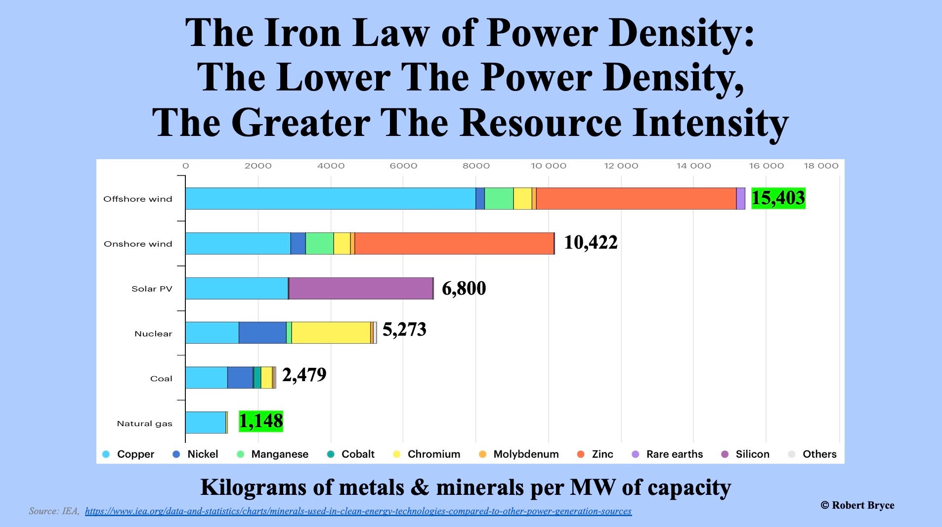 The shape and size of our energy systems are not being determined by political beliefs about climate change. Instead, those systems are ruled by the Iron Law of Power Density which says: the lower the power density, the greater the resource intensity. This can easily be seen in the graphic above. It includes a screen grab from a 2021 International Energy Agency report on the mineral intensity of various methods of electricity generation. The mineral intensity of offshore wind, including huge amounts of copper and zinc, is shocking: roughly 15,400 kilograms per megawatt of generation capacity. That is roughly 13 times more than the amount needed for natural gas-fired generation (1,148 kg) and six times more than what’s needed for a coal plant (2,479 kg).