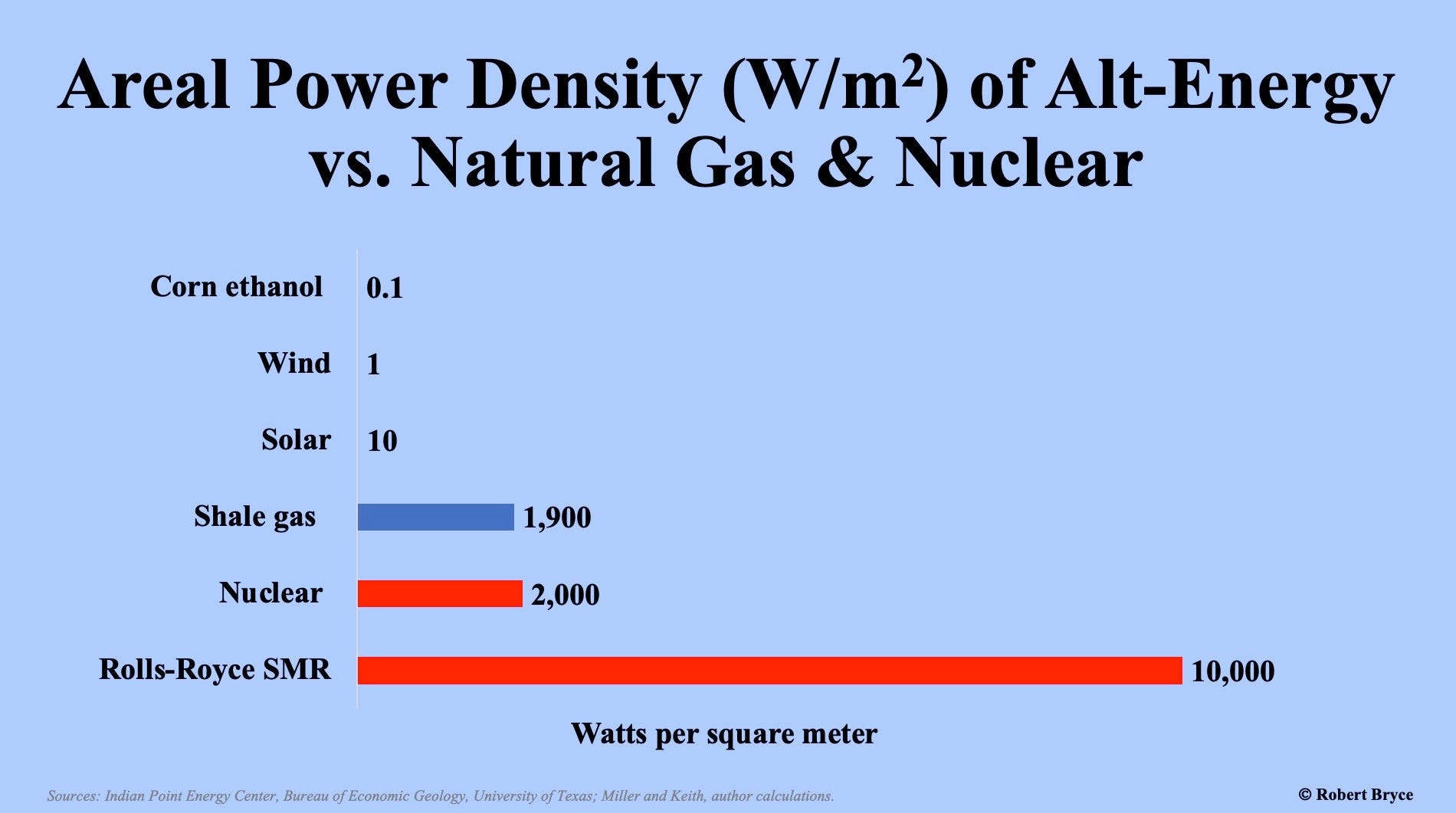 Power density is the measure of energy flow that can be harnessed from a given area, volume, or mass. Power density is a measure of how many watts we can get per square meter, liter, or kilogram from a given source. This article focuses on areal power density. Proving why low-power-density sources are the wrong choice for modern society takes only a modicum of effort.