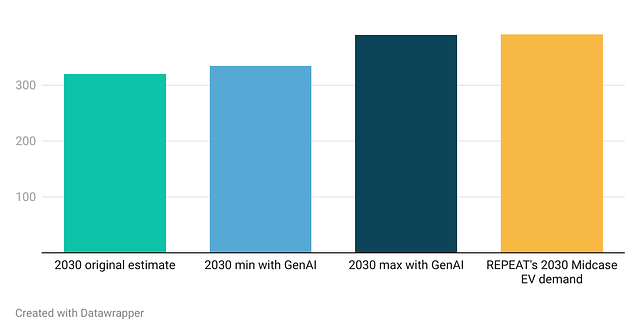 Electricity demand from electric vehicles (EVs) may prove to be comparable or even higher than that of AI. The Princeton REPEATmodel estimates the demand for electricity in the United States at 391 TWh for EV transportation (light-duty vehicles and other electric transport) in 2030, which is similar to BCG’s 2030 estimates for data centers (320 - 390 TWh). Rystad Energy predicts EV usage will grow from 18.3 TWh to 131 TWh for the same period. Despite the additional energy demand, policymakers strongly encourage the purchase of EVs and the construction of charging infrastructure, while commentators seem relatively unconcerned about EV charging needs. This may be because EVs are seen to be filling an existing societal need for transportation, as well as a solution to the problem of climate change. Even though AI has potential to raise productivity and improve lives, it is a new and energy-intensive technology whose value runs counter to the priorities of the environmental community.