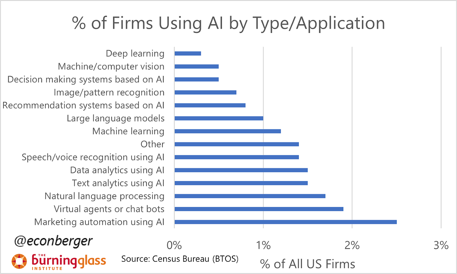 But a closer look reveals a more complex relationship between AI use and energy demand, energy efficiency, and decarbonization that isn’t all bad news. First, there is the question of whether businesses are using AI. With data from the US Census Bureau, Guy Berger at the Burning Glass Institute shows that the two most common applications of AI are marketing automation (2.5% of US businesses) and virtual agents/chat bots (1.9% of businesses). Only 1% of businesses have used large language models. Berger’s analysis also shows that labor-saving uses of AI are still quite small, with 1 out of every 4 businesses using AI to perform a few tasks that were previously carried out by humans. And the largest businesses are most likely to say that they are using AI but also the most likely to say that they don’t know if they are using AI. Of course, the use of AI will increase in the future, but for now, it seems mostly confined to a few sectors and activities.