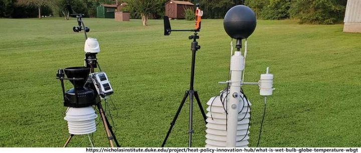 On the mic-stand (middle) is a stand-alone Kestrel 5400 WBGT meter couple with a wind vane to turn the anemometer to the wind. The Kestrel system approximates the WBGT closely enough for safety purposes. We can see (mostly) the needed elements: air temperature, humidity (directly or via a wet bulb thermometer), radiation (black globe) and wind speed.
