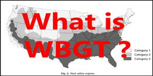 So, what exactly is Wet-Bulb Globe Temperature? “The wet-bulb globe temperature (WBGT) is a type of apparent temperature used to estimate the effect of temperature, humidity, wind speed (wind chill), and visible and infrared radiation (usually sunlight) on humans.” This “apparent temperature” (calculated in F or C) is not a temperature at all, but rather just a value – a number – an index — that can be shown as a scale and given as a scale of potential heat stress that might be experienced in direct Sun and strenuous human activity — think, construction work, agricultural laborers or a high school sports team during afternoon football or soccer practice. This index was originally developed in the 1950s by the U.S. military to reduce heat stress deaths during military training exercises. WBGT is intended to be used as a guide to managing workload stress in direct sunlight. Another version of WBGT can be used indoors by ignoring some of the elements used to calculate it (wind speed, and “visible and infrared radiation (usually sunlight).”