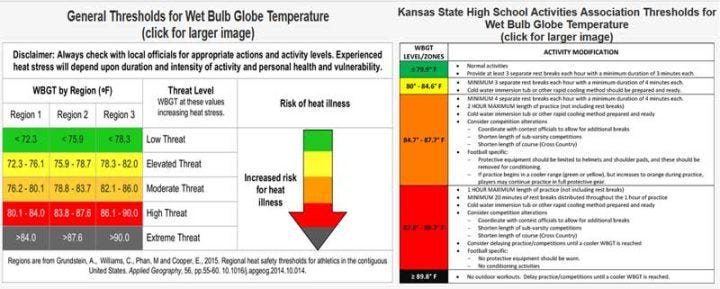To measure heat stress conditions, a heat stress meter, which measures inputs and calculates WBGT, is needed. U.S. Occupational Safety and Health Administration (OSHA) says this: “WBGT measurements are most reliable when taken at, or as close as possible to, the work area. When a worker moves between two or more areas with different environmental conditions, or when the conditions vary substantially in the work area, assess the heat hazard using representative measurements for the different conditions.” For OSHA, this may mean measuring WBGT in each room or area of a worksite. For school sports, “The WBGT [device] should be set up in the sun, not under shade. If you are practicing on turf, it should be set on the turf.” [ source ] Not just anywhere at the school, not on the school quad or outside the principal’s office window, but actually on the playing field in the stadium where conditions will be different than in the spectator stands or on the sidelines.
