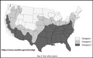 It is interesting to note that the hotter and more humid parts of the country, Region/Category 3 (dark grey) have higher allowable WBGT index readings and the cooler, less humid regions have lower allowable index readings.
